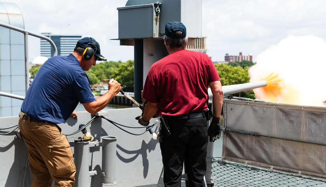 Did you know that you can donate to fire either the Battleship’s 5-inch gun or 40mm saluting gun nearly any day and time? We ask for a $500 donation to pull the trigger of the ship’s port-side 5-inch gun, and a $100 donation to fire the ship’s 40mm saluting gun. Don’t worry—we’re not blowing up Pennsylvania. We only fire blanks, but it makes a nice fireball and very loud bang!